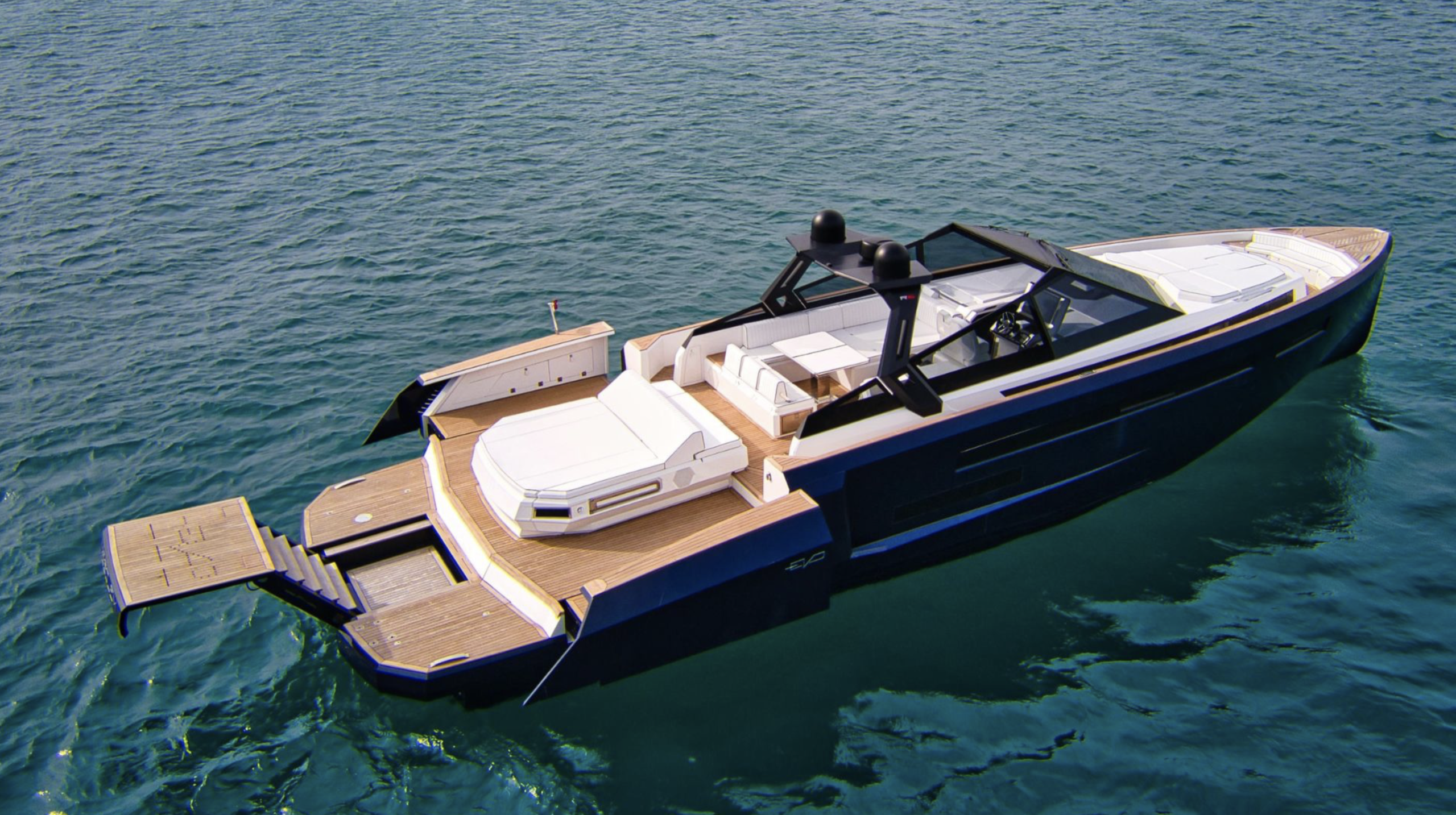 Her expansive deck is designed for ultimate relaxation and entertainment, highlighted by EVO Yachts’ signature opening side terraces that transform the cockpit into a generous beach club. Multiple lounging areas and a refined dining space create the perfect atmosphere for enjoying long, sun-filled days along the coastline.